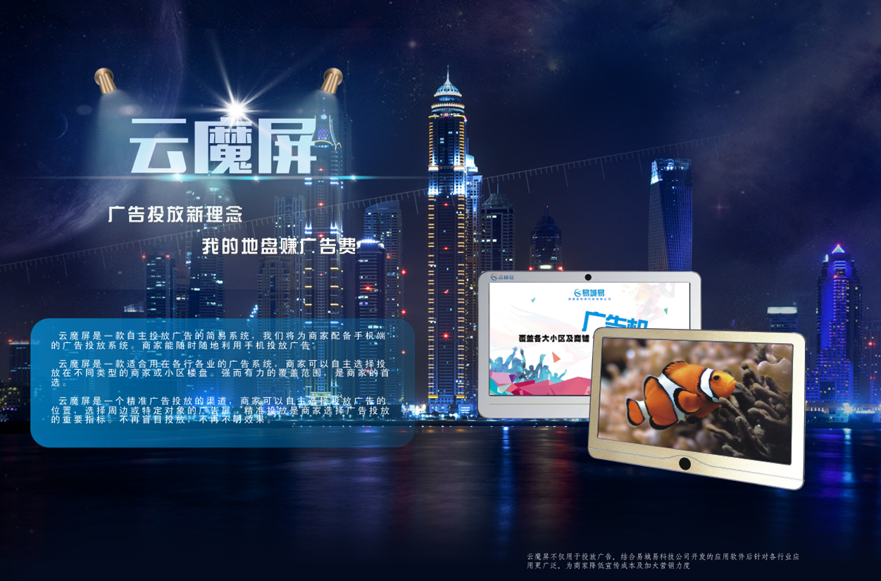 易城易云魔屏+是互聯(lián)網(wǎng)+傳媒+智能硬件與軟件的科技。專注打造“互動(dòng)媒體+廣告”的新媒體平臺(tái),以做為應(yīng)用場(chǎng)景,增加商家的宣傳價(jià)值、開創(chuàng)互聯(lián)網(wǎng)互動(dòng)媒體新局面。